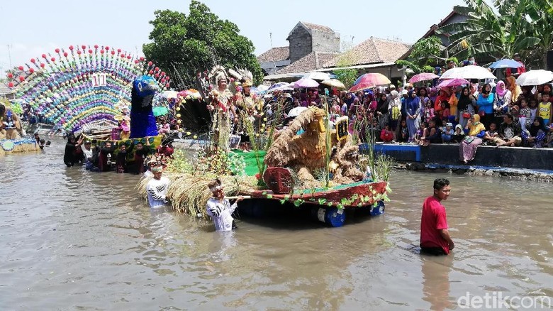 Di atas rakit tersebut juga bangun model yang menggunakan kostum senada. Rakit-rakit dari drum dan bambu itu lalu digerakkan 8-10 orang.
