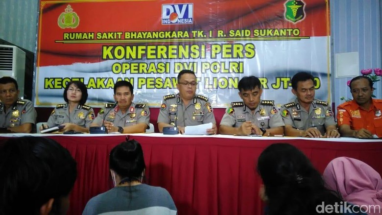 Jumpa pers hasil identifikasi 20 mayat korban Lion Air, Kamis (8/11/2018) Foto: Adhi Indra -detikcomJakarta -Tim DVI Polisi Republik Indonesia mengidentifikasi 20 mayat korban jatuhnya pesawat Lion Air PK-LQP teridentifikasi. Hingga ketika ini total 71 mayat yang teridentifikasi.
