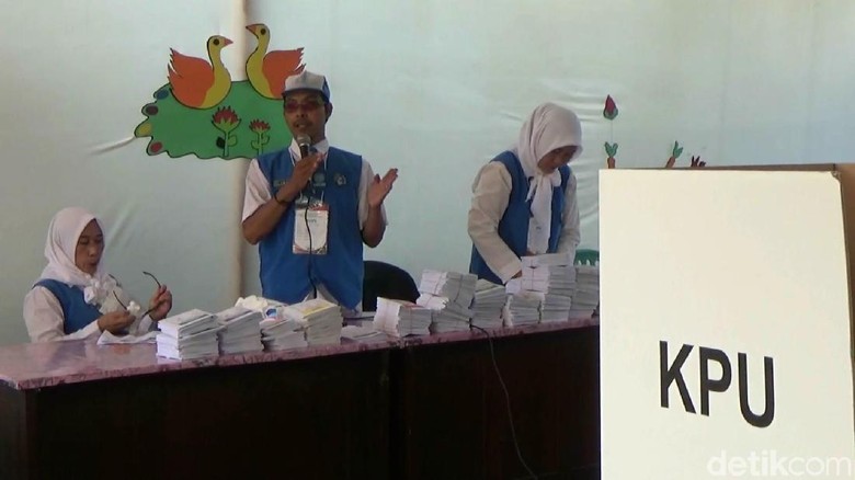 Petugas TPS berbaju anak TK/Foto: Muhajir ArifinPasuruan -Berbagai cara dilakukan penyelenggara pemilu untuk menarik minat pemilih. Salah satunya menciptakan TPS bertema Taman Kanak-Kanak (TK).